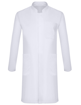 Der Herrenkittel mit langen Ärmeln, bequem und praktisch, bietet Schutz am Arbeitsplatz. Er hat einen charakteristischen verdeckten Verschluss mit rostfreien Druckknöpfen, die unter der Falte verborgen sind. Dies macht den Verschluss sowohl ästhetisch ansprechend als auch langlebig. Er ist mit zwei unteren, symmetrisch aufgenähten Taschen ausgestattet, in denen Utensilien und andere notwendige Dinge griffbereit sind. Außerdem gibt es eine Tasche auf der linken Brustseite, in der kleinere Gegenstände verstaut werden können. Der Kittel reicht oberhalb des Knies. Der Halsausschnitt ist mit einem kleinen Stehkragenversehen, der dem Kittel einen modernen Touch verleiht. Die Rückseite des Kettels hat einen Schnitt und eine Öffnung für mehr Bewegungsfreiheit. Die Farbe des Kittels ist einheitlich, ohne kontrastierende Einsätze, was ihn vielseitig einsetzbar macht.