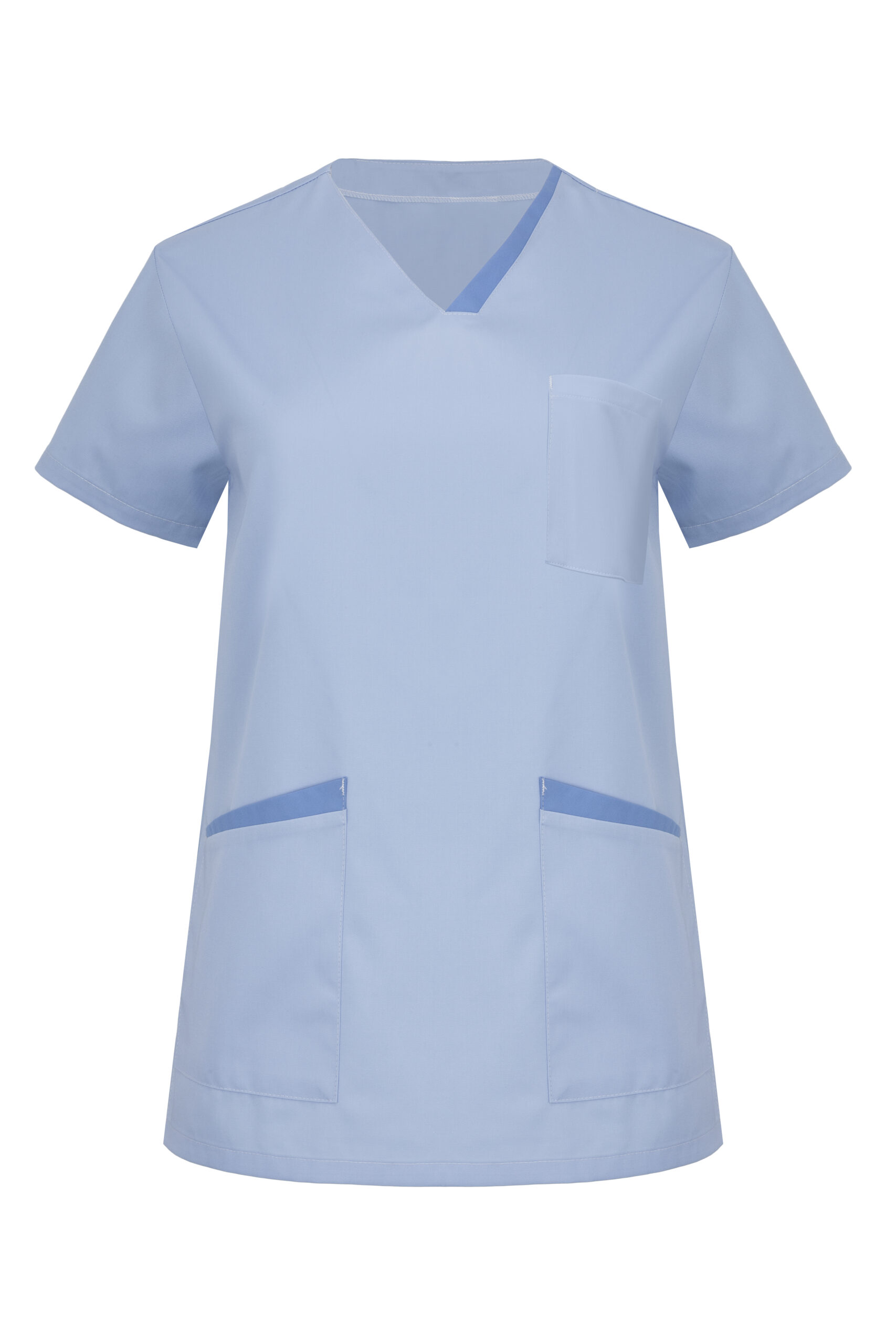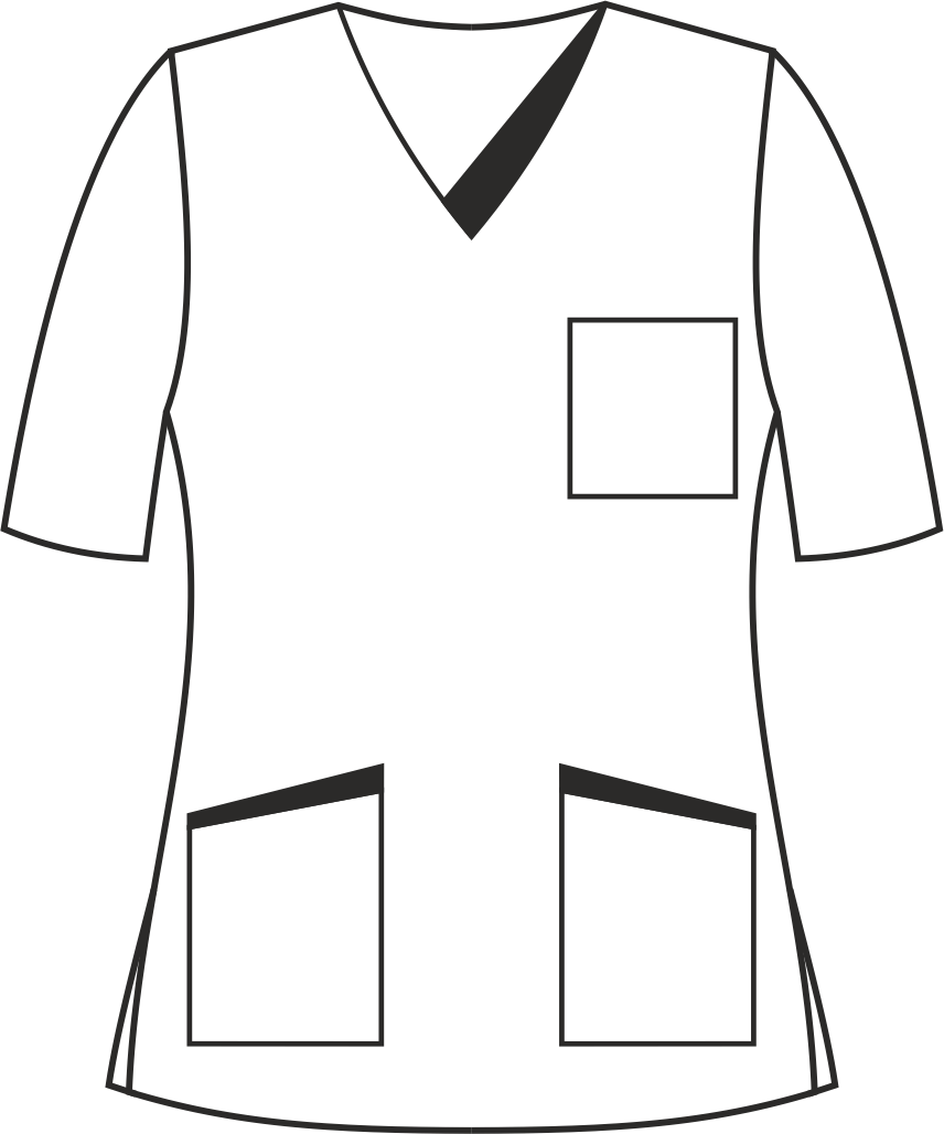 Bluza ta jest zarówno stylowa, jak i praktyczna. Dekolt jest wykończony w kształcie litery V, co dodaje jej subtelności. Wyposażona jest w górną kieszonkę oraz w dwie dolne symetrycznie naszyte kieszenie, które są przeznaczone do przechowywania drobnych rzeczy. Kontrastowe wstawki na dolnych kieszeniach oraz w lewej części dekoltu, nadają bluzie unikalnego charakteru i wyróżniają ją spośród innych. Lekko taliowana bluza posiada również rozcięcia boczne, które zapewniają swobodę ruchów i komfort podczas aktywności. Bluza ma długość do połowy bioder. Model ten jest wkładany przez głowę, dostępny z krótkim rękawem.