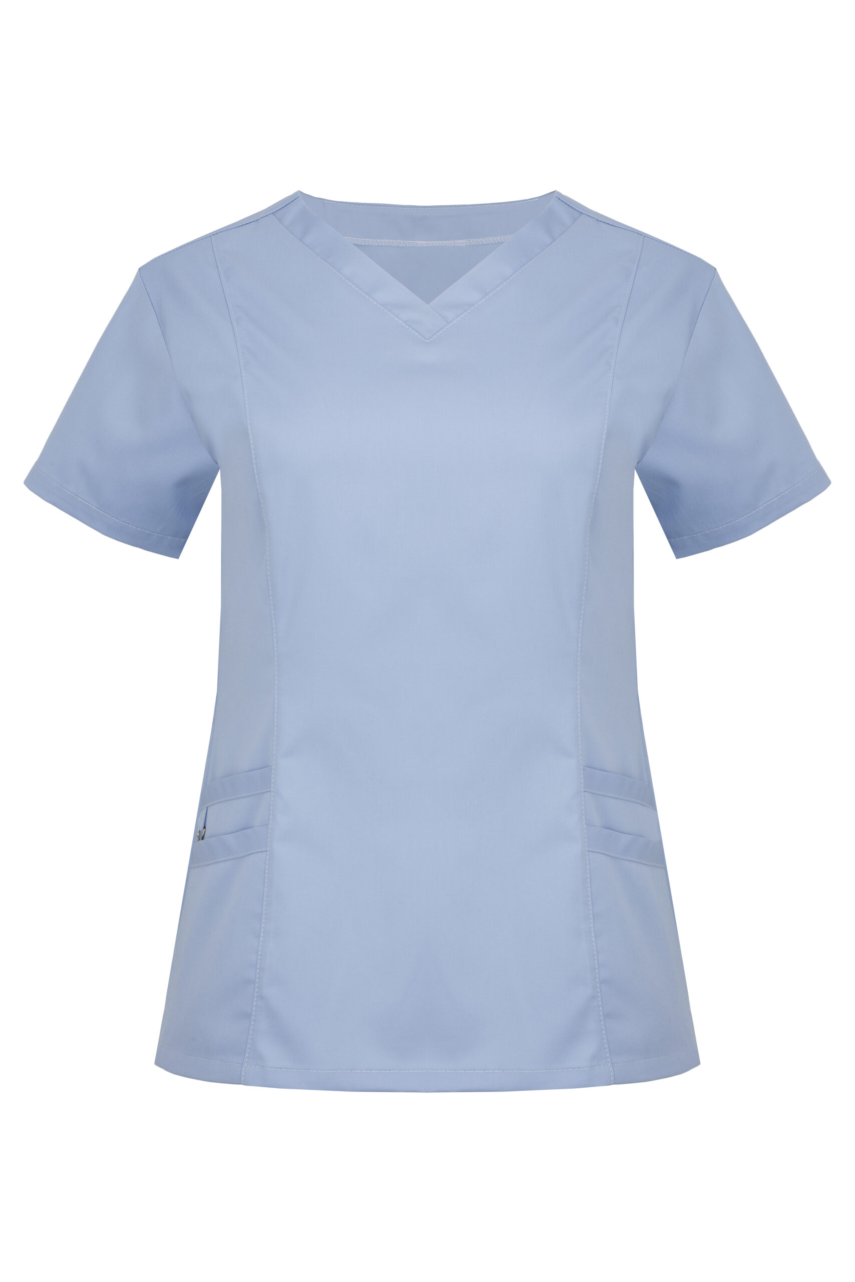 Bluza medyczna łączy stylowy wygląd, wygodę i funkcjonalność, co sprawia, że jest doskonałą opcją dla profesjonalistów medycznych. Wykończenie pod szyją w kształcie litery V z dodatkową pliską w kolorze bluzy subtelnie eksponuje dekolt. Analogiczne pliski na dolnych, podwójnych kieszonkach stanowią interesujący akcent. Bluza jest taliowana, co sprawia, że idealnie dopasowuje się do sylwetki, zapewniając atrakcyjny wygląd. Jej długość sięgającą do połowy bioder, sprawia, że jest wygodna i praktyczna podczas codziennych obowiązków. Kolor bluzy jest jednolity, bez kontrastowych wstawek, co czyni ją uniwersalną i łatwą do dopasowania do innych elementów garderoby. Dodatkowym praktycznym elementem jest wszyte półoczko, które umożliwia zawieszenie identyfikatora lub kluczy. Dzięki temu będziesz mieć je zawsze pod ręką i łatwo dostępne.