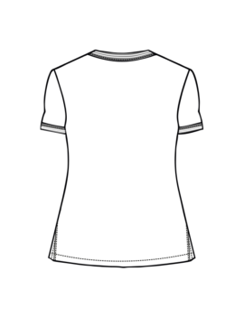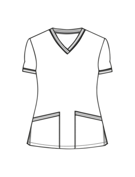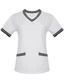 Zaprojektowana z myślą o kobietach pracujących w środowisku medycznym, łącząc funkcjonalność z eleganckim stylem. Do wykończenia dekoltu w kształcie litery V, rękawków i kieszeni zastosowano ozdobną, elastyczną taśmę w kolorze granatowym z białymi paseczkami przetykanymi złotą nitką. Ten detal nadaje szyku i subtelności. Bluza jest taliowana, co sprawia, że doskonale dopasowuje się do sylwetki. Długość sięgającą do połowy bioder zapewnia komfort noszenia i swobodę ruchów. Jest wyposażona w dwie dolne, symetrycznie naszyte kieszenie, które umożliwiają przechowywanie niezbędnych przedmiotów w zasięgu ręki.