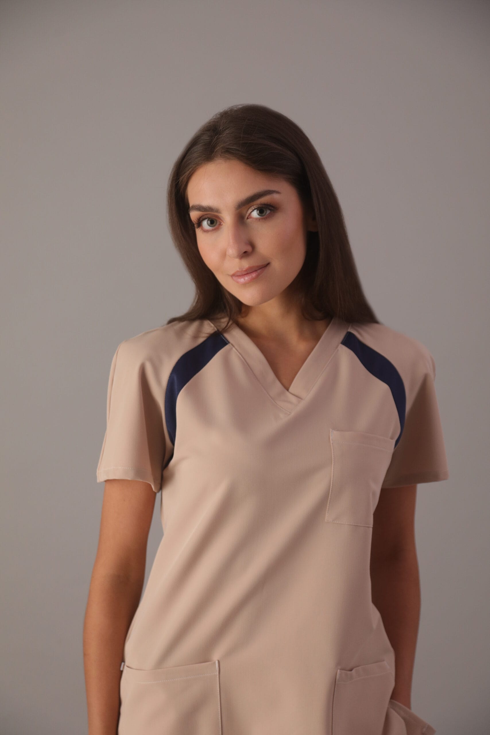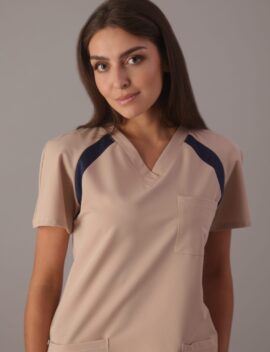 Zaprojektowana z myślą o kobietach pracujących w środowisku medycznym, łącząc funkcjonalność z eleganckim stylem. Elastyczne wstawki z przodu i tyłu bluzy sprawiają, że tkanina pracuje z ciałem nawet przy najbardziej wymagających ruchach. Bluza jest taliowana, co sprawia, że doskonale dopasowuje się do sylwetki. Długość sięgającą do połowy bioder zapewnia komfort noszenia i swobodę ruchów. Jest wyposażona w dwie dolne, symetrycznie naszyte kieszenie, które umożliwiają przechowywanie niezbędnych przedmiotów w zasięgu ręki.