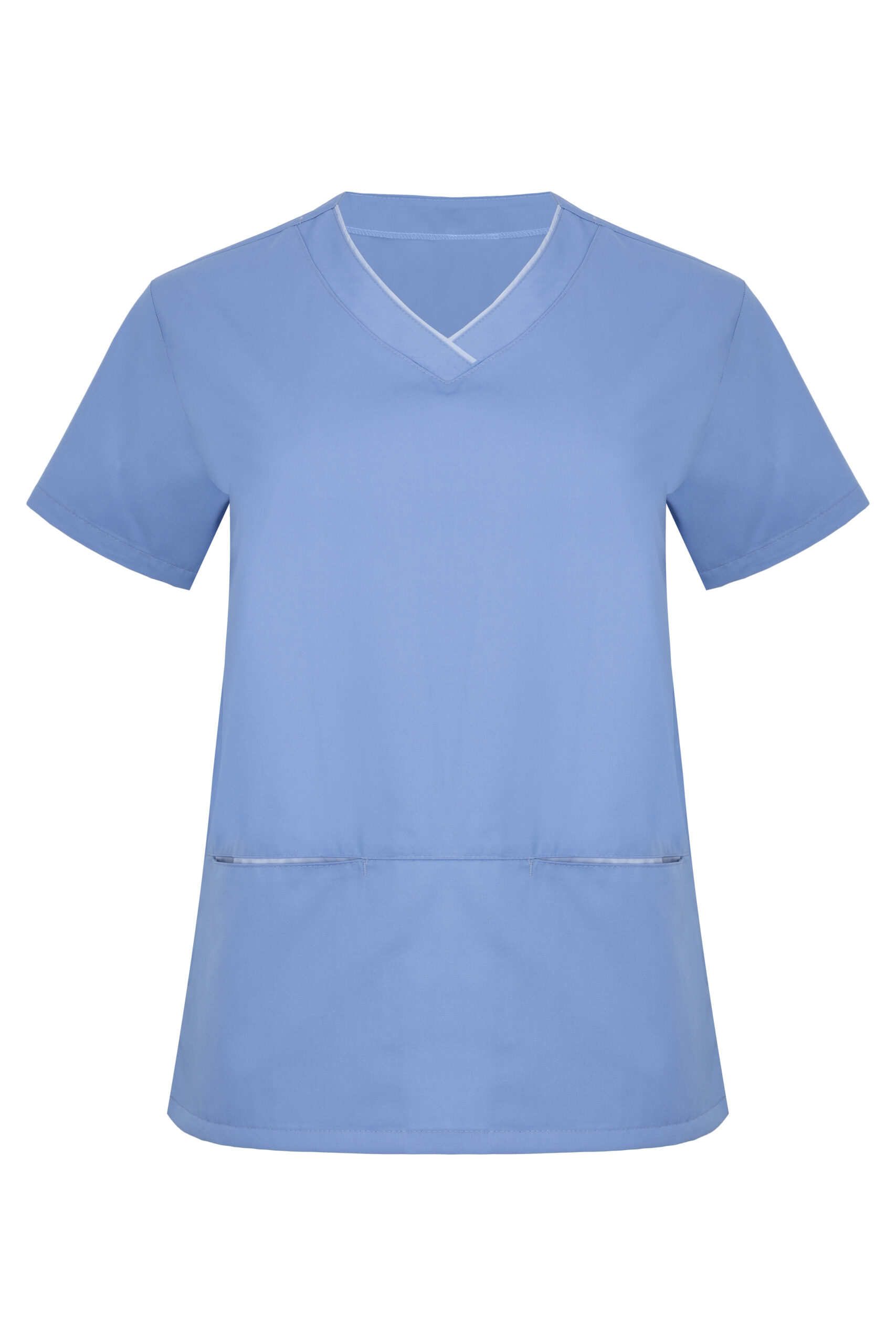 Bluza medyczna z krótkim rękawem, wkładana przez głowę, sięgająca do połowy bioder zapewnia wygodę noszenia. Jest taliowana, co sprawia, że doskonale dopasowuje się do sylwetki. Rozcięcia boczne w bluzie zapewniają swobodę ruchów, co jest szczególnie ważne w przypadku wykonywania czynności związanych z pracą medyczną.