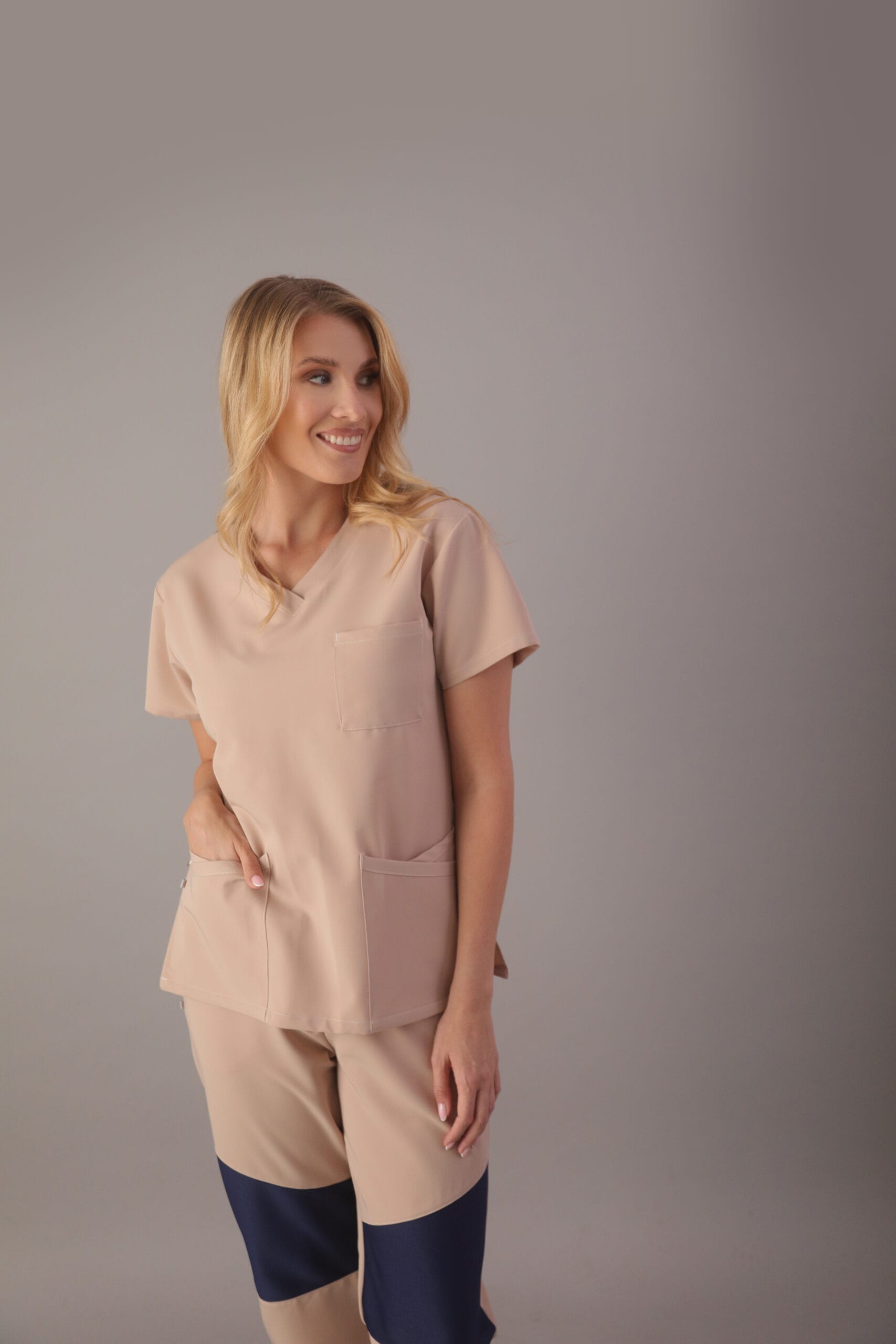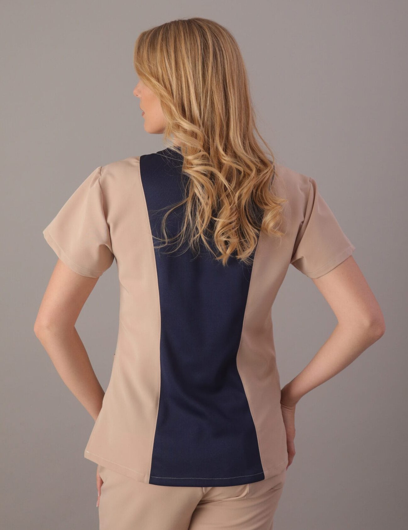 Bluza medyczna została stworzona z myślą o komforcie i stylu. Na plecach bluzy wszyta została elastyczna tkanina, zapewniając wygodę i swobodę ruchów. Jest to szczególnie pożądane do pracy z pacjentami, w której stale towarzyszy zmiana pozycji ciała. Dekolt w kształcie serka z ozdobną, szeroką plisą nadaje bluzie subtelny i kobiecy wygląd. Jednym z wyróżniających elementów tego modelu są dwie podwójne kieszenie, które pozwalają na praktyczne przechowywanie niezbędnych narzędzi i akcesoriów. Taliowany krój i długość sięgająca do połowy bioder podkreślają sylwetkę.