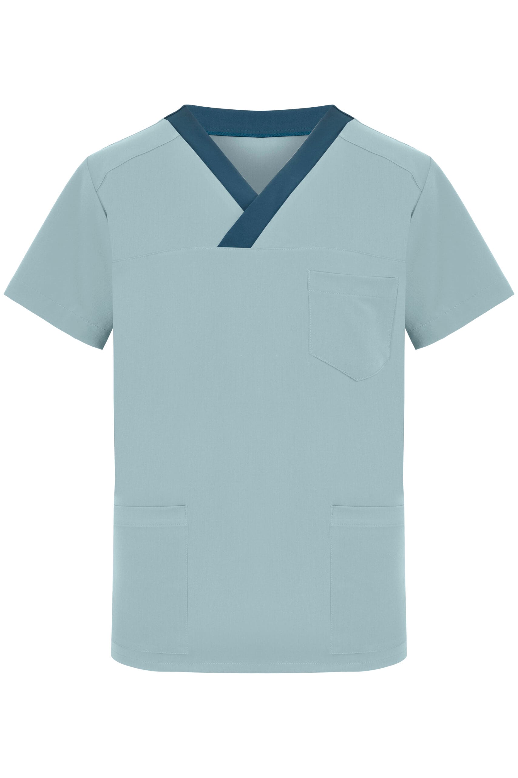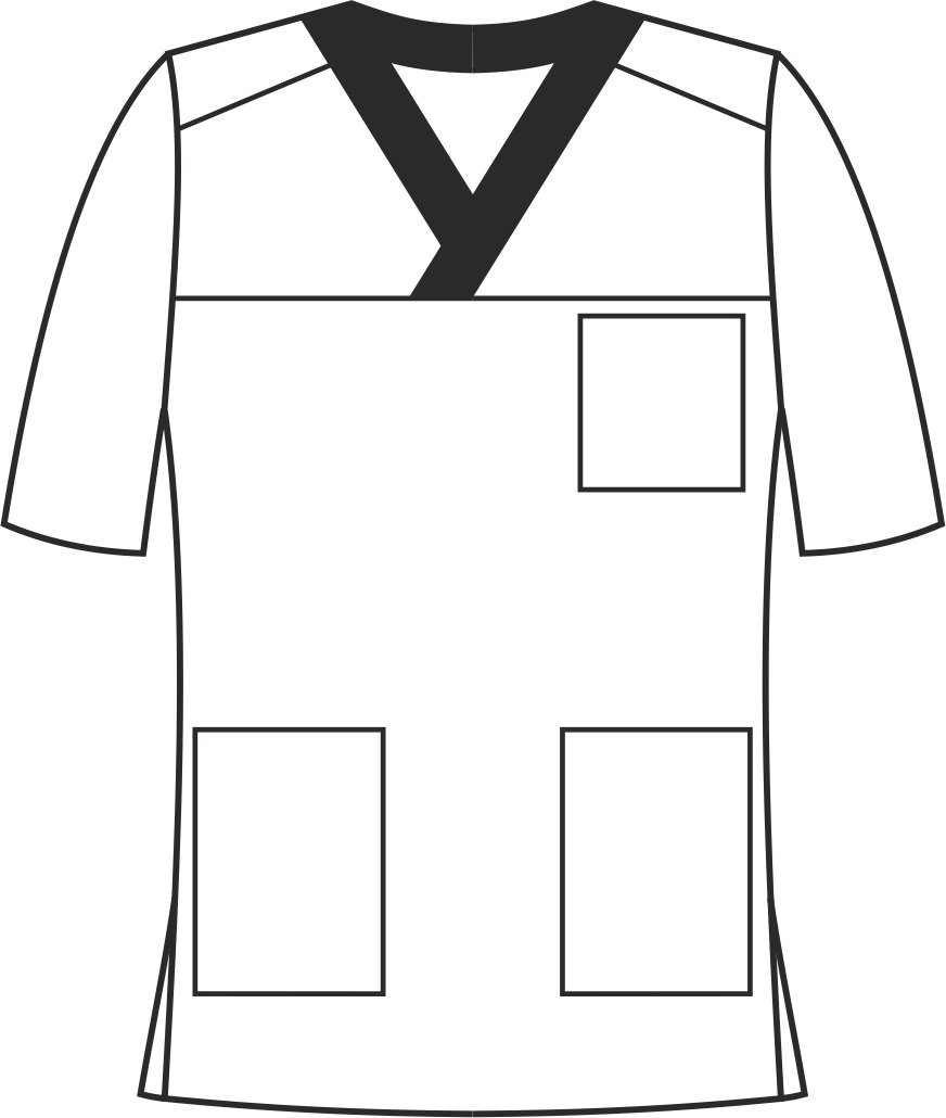 Medyczna bluza męska z krótkim rękawem, która doskonale łączy funkcjonalność i styl. Dekolt bluzy ma kopertowy fason, wykończony w szpic kontrastową, szeroką lamówką, co stanowi o jej wyjątkowym charakterze. Bluza ma odcięty karczek z przodu, który nadaje jej oryginalności, a skośne cięcia na ramionach wyjątkowego stylu i dynamiki. Długość do połowy bioder oraz rozcięcia boczne zapewniają swobodę ruchów. Wyposażona jest w praktyczną kieszeń na prawej piersi oraz dwie kieszenie dolne, które umożliwiają przechowywanie drobnych przedmiotów w zasięgu ręki. Model został zaprojektowany z myślą o wygodzie i komforcie podczas wykonywania codziennych obowiązków.