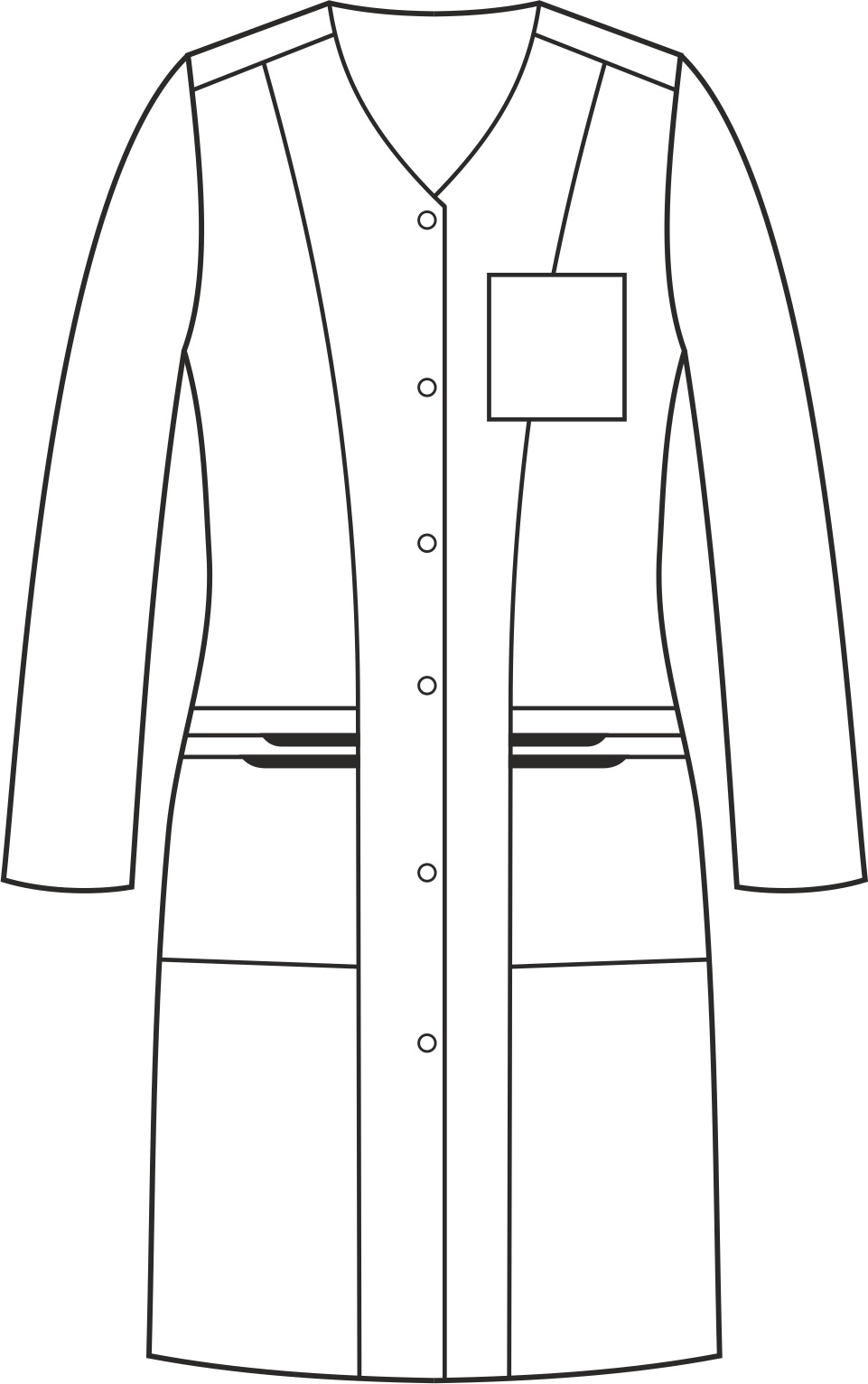 Fartuch jest idealny dla osób, które cenią sobie profesjonalny wygląd i praktyczne rozwiązania w swojej pracy. Jest dostępny w wersji z krótkim lub długim rękawem, zapinany na nierdzewne springi (napy), zapewniające łatwe i wygodne zapięcie. Model wyposażony jest w dwie dolne, symetrycznie naszyte kieszenie, służące do przechowywania niezbędnych narzędzi i przyborów. Dodatkowo, na lewej piersi znajduje się kieszonka idealna na mniejsze przedmioty. Fartuch o długości przed kolano, zapewnia ochronę i wygodę w codziennej pracy. Dekolt w kształcie litery V (serek) nadaje fartuchowi elegancki wygląd. Fartuch posiada dwa pionowe cięcia modelujące z przodu, które dodają mu charakteru i stylu. Dolne kieszenie oraz krótkie rękawy ozdobione są oryginalnymi, podwójnymi wstawkami.