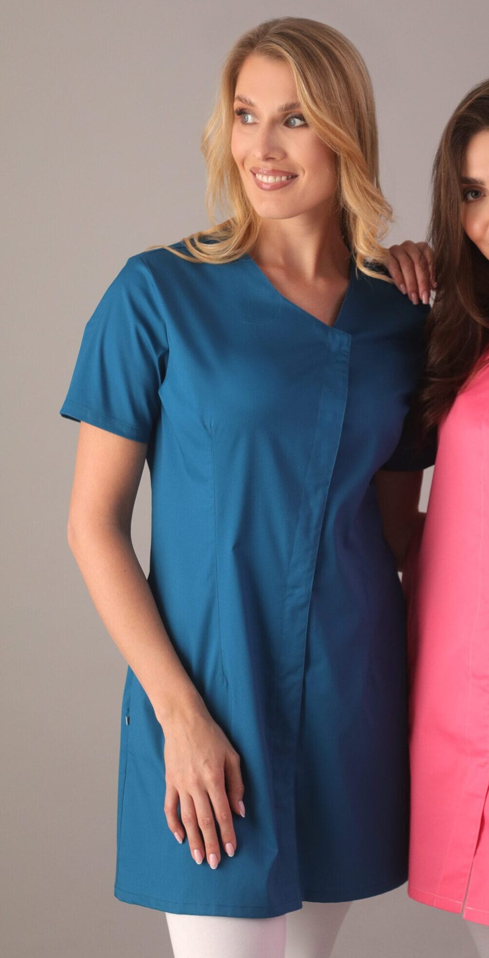 Tunika jest dostępna w wersji z krótkim lub długim rękawem. Zapinana jest na wygodne i trwałe nierdzewne springi (napy). Wyposażona jest w dwie dolne wpuszczane kieszenie, które pozwalają na przechowywanie narzędzi niezbędnych przedmiotów w łatwo dostępnym miejscu. Wyróżnia się asymetrycznym podkrojem szyi oraz zapięciem, co nadaje tunice oryginalny i stylowy wygląd. Sięga przed kolano, co zapewnia ochronę i swobodę ruchów podczas pracy. Posiada z tyłu i z przodu zaszewki podkreślające sylwetkę. Jednolity kolor sprawia, że tunika jest uniwersalna i elegancka.
