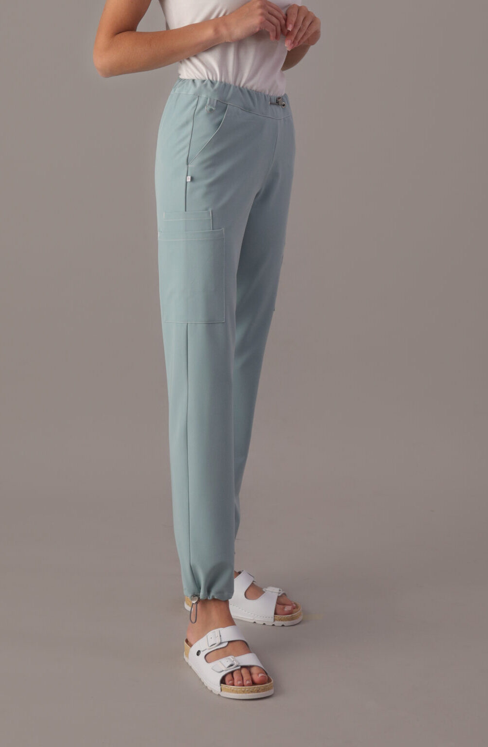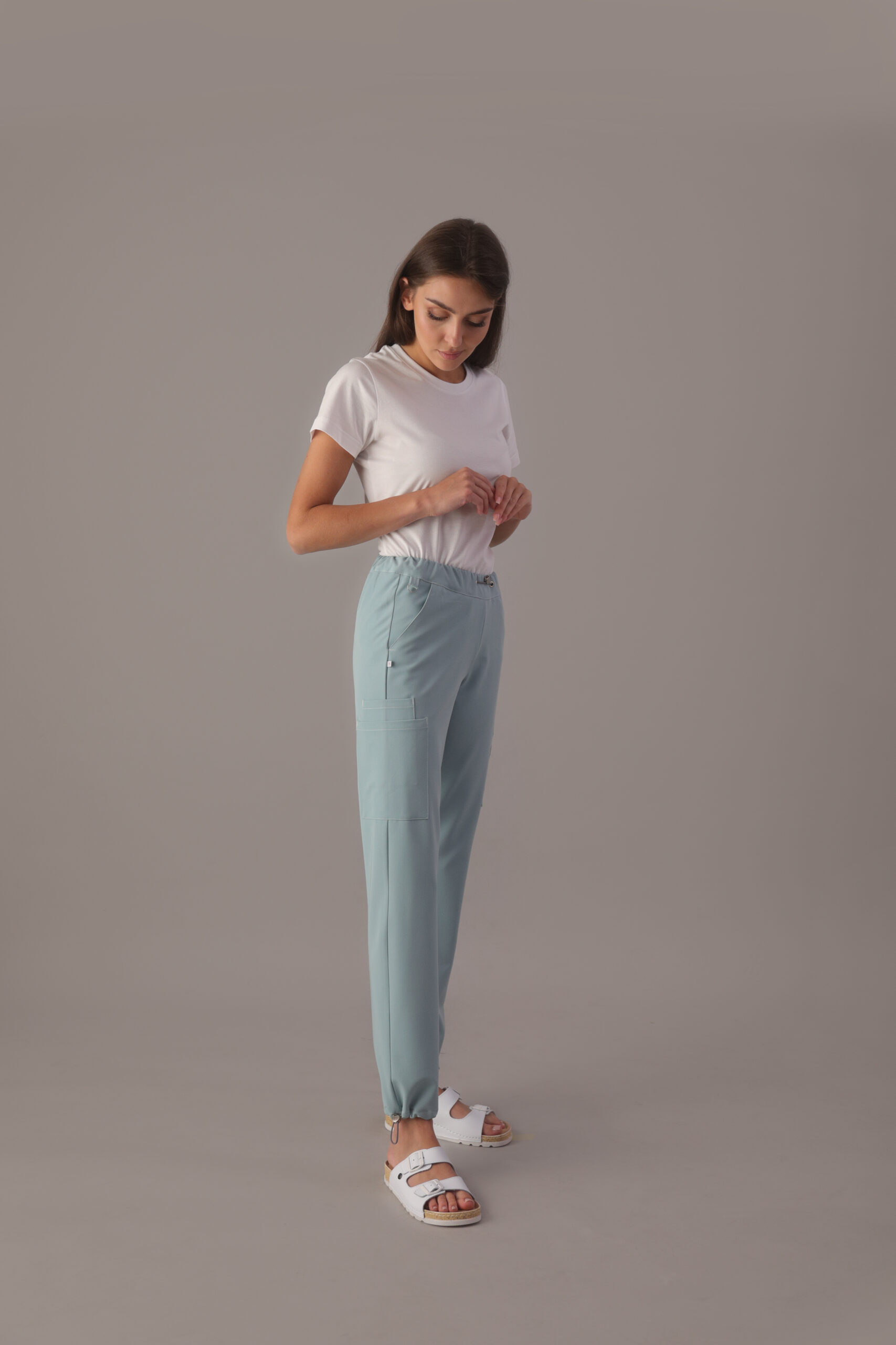 Spodnie damskie typu jogger, które łączą w sobie wygodę spodni dresowych i modny wygląd. Posiadają gumę wszytą w całym obwodzie pasa zapewniającą idealne dopasowanie i komfort. Dodatkowo, wyposażone są w stoper, który umożliwia regulację, aby jeszcze lepiej dopasować je do figury. Nogawki spodni zakończone są gumowymi stoperami, co nadaje im charakterystyczny wygląd joggerów i zapewnia wygodne dopasowanie wokół kostek. Posiadają dwie wpuszczane kieszenie biodrowe oraz dwie podwójne kieszenie na udach, które umożliwiają przechowywanie drobnych przedmiotów w zasięgu ręki. Przy pasie znajduje się wszyte półoczko, które pozwala na zawieszenie identyfikatora lub kluczy, zapewniając praktyczność w codziennym użytkowaniu. Będą one doskonałym wyborem na co dzień, zapewniając Ci swobodę i stylowy wygląd.