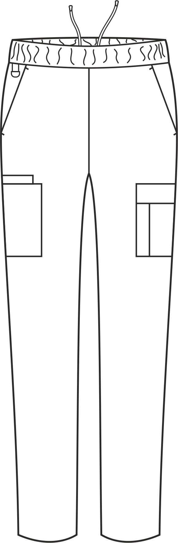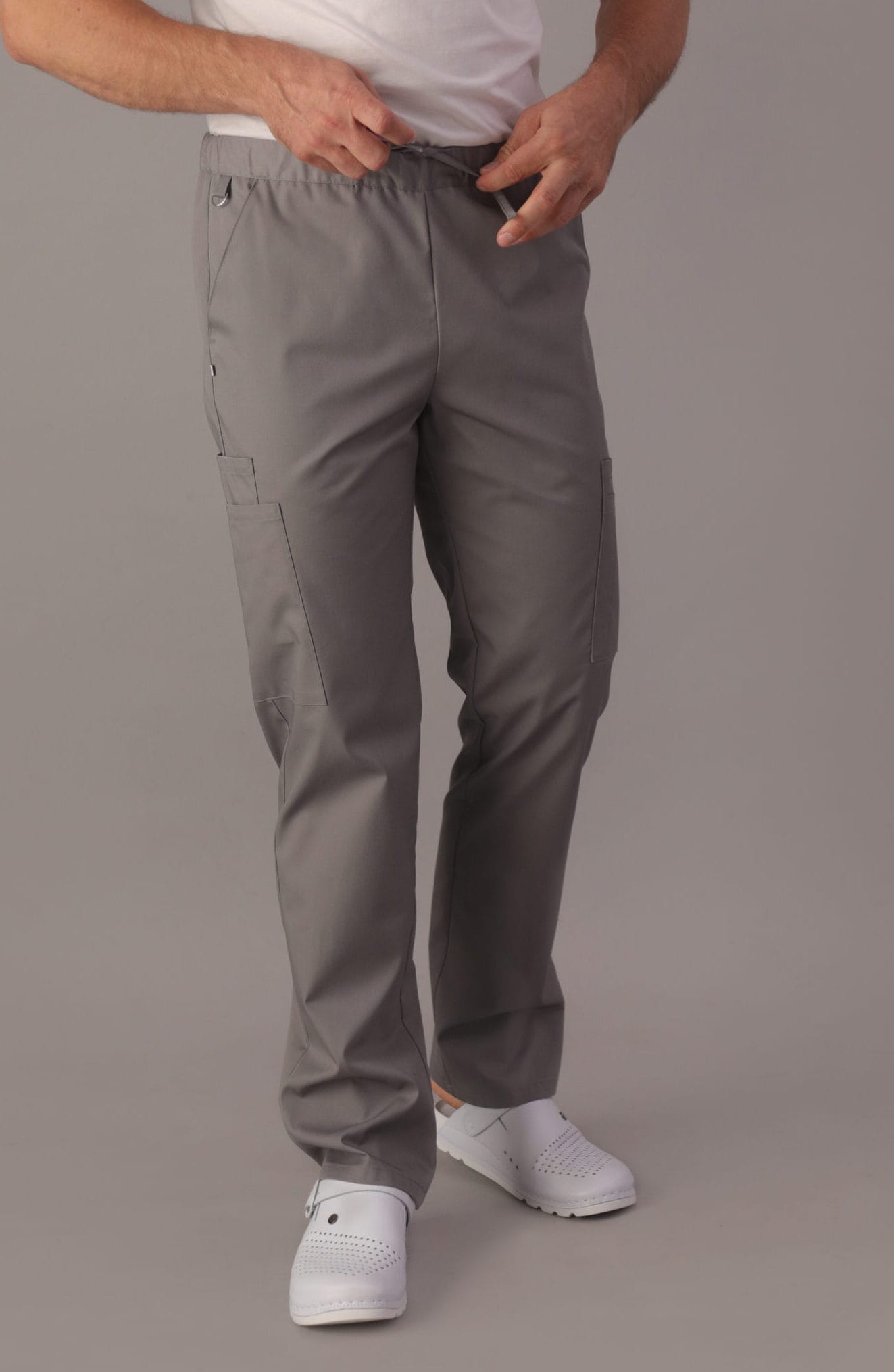 Medyczne spodnie męskie typu „bojówki”, które łączą w sobie wygodę, funkcjonalność i modny wygląd. Wyposażone są w dwie wpuszczane kieszenie biodrowe, dwie boczne podwójne kieszenie na udach, co umożliwia przechowywanie różnych przedmiotów w zasięgu ręki. Spodnie mają wysoki stan i lekko zwężane nogawki, dzięki czemu świetnie się prezentują. Wszyta guma w pasie z trokami wewnętrznymi doskonale dopasowuje spodnie do figury.