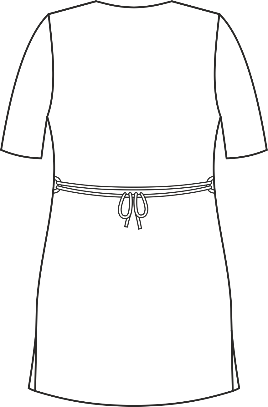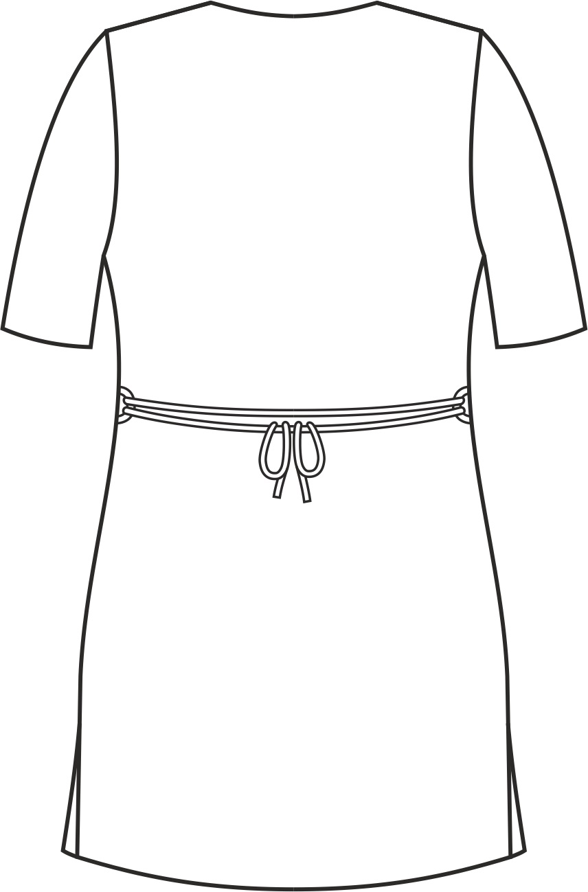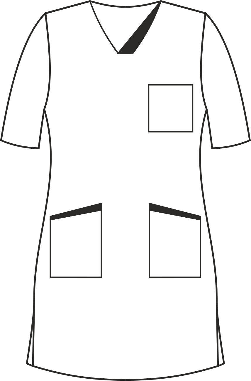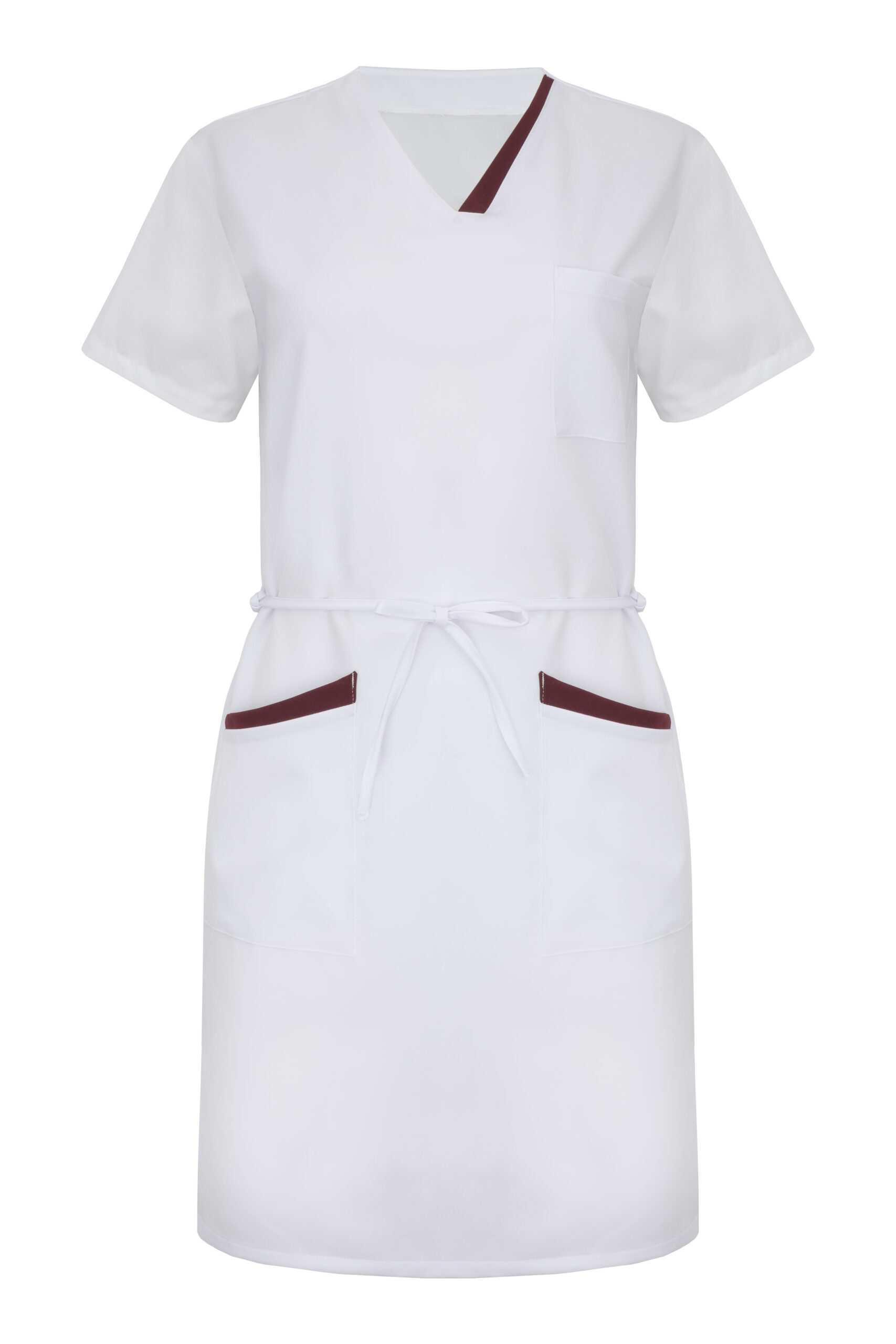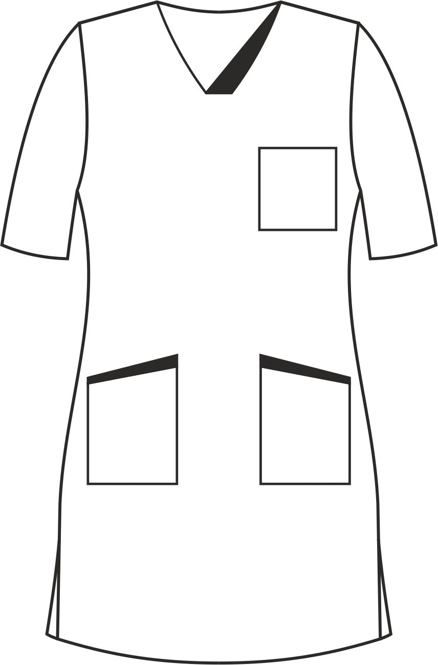 Sukienka medyczna z krótkim rękawem została zaprojektowana z myślą o salach operacyjnych. Wyposażona jest w dwie dolne kieszenie i jedną na lewej piersi. Jej długość sięga przed kolano. Dekolt jest wykończony w szpic. Sukienka jest taliowana szwami bocznymi co sprawia, że sukienka podkreśla delikatnie kobiecą sylwetkę. Kontrastowe wstawki przy szyi i dolnych kieszeniach nadają sukience unikalnego stylu. Sukienka posiada dwa boczne rozcięcia, które pozwalają na swobodę ruchów. Trok można wiązać zarówno z przodu jak z tyłu sukienki w zależności od preferencji.