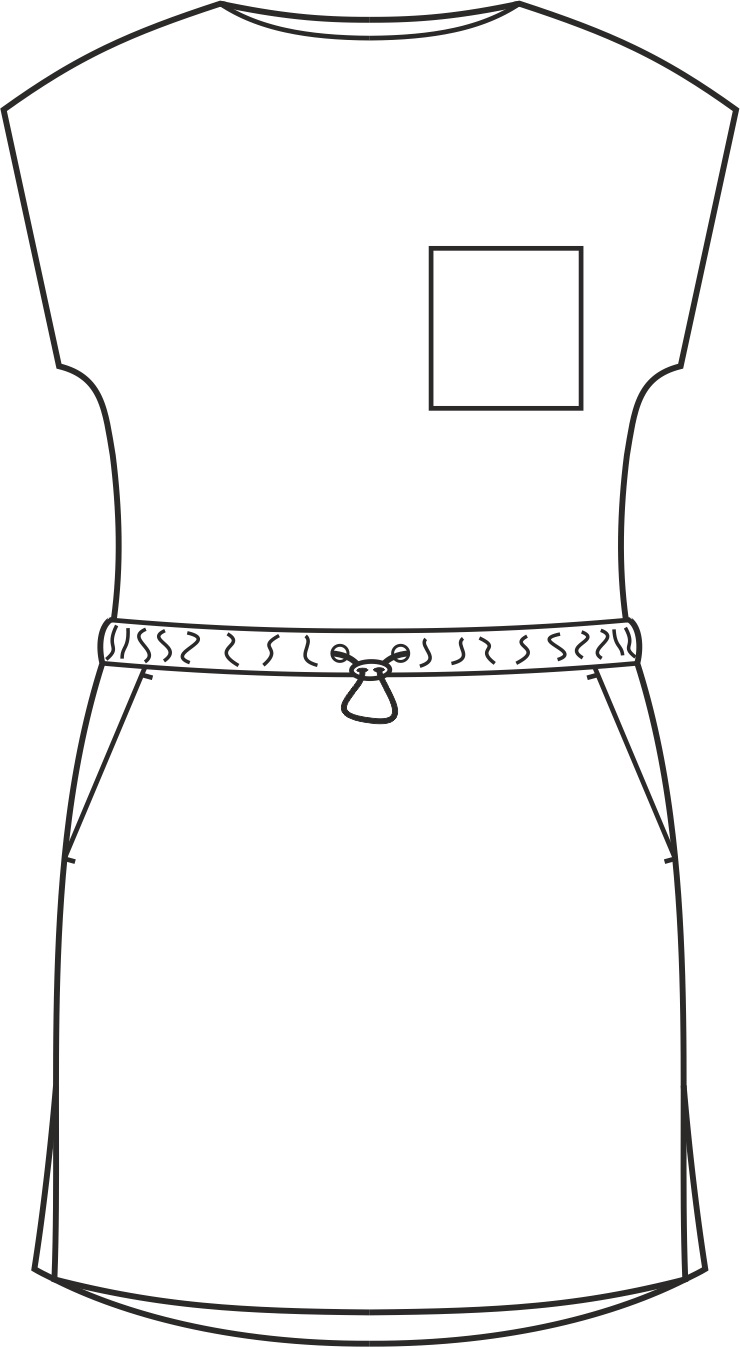 Sukienka została zaprojektowana z myślą o komforcie i doskonałym wyglądzie. Jest dostępna w wersji z z krótkim rękawem, jej długość sięga przed kolano. Wyposażona jest w praktyczną kieszeń na lewej piersi, zapewniającą miejsce na przechowywanie drobnych przedmiotów zawsze pod ręką oraz dwie kieszenie dolne. Sukienka posiada sznurek w tunelu lekko poniżej talii, który pozwala na regulację jej dopasowania i dodaje sukience sportowego akcentu.