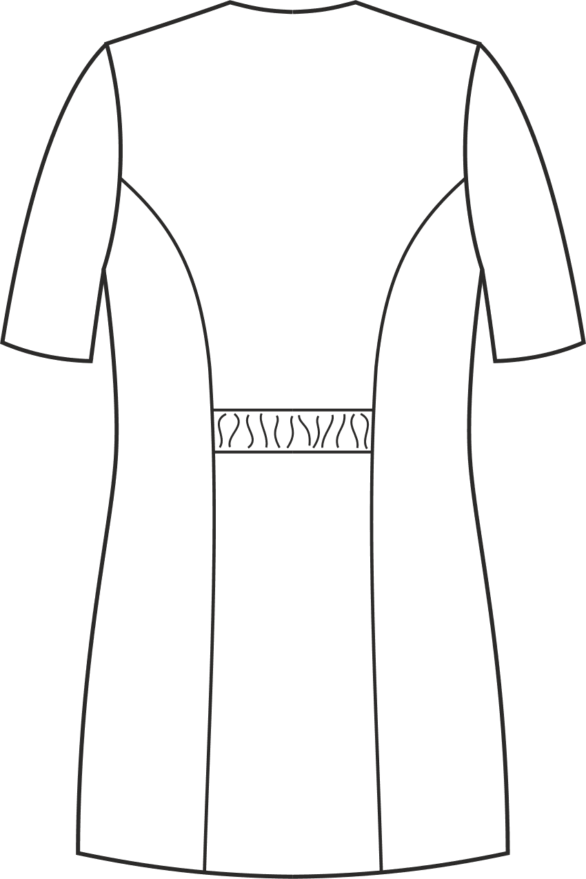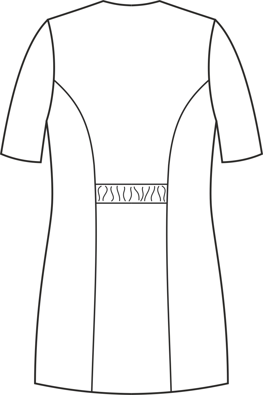 Wyposażona jest w dwie symetrycznie umieszczone dolne kieszenie, zapewniające praktyczne miejsce do przechowywania drobnych przedmiotów, takich jak klucze czy telefon. Na lewej piersi znajduje się kieszonka. Taliowany krój oraz pionowe cięcia modelujące podkreślają sylwetkę, nadając jej idealnych proporcji. Kolor tuniki jest jednolity, co podkreśla jej elegancki charakter i umożliwia łatwe dopasowanie do różnych stylizacji. Można ją zamówić w wersji z krótkim lub długim rękawem.