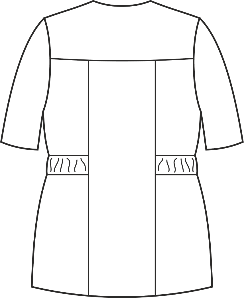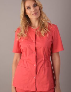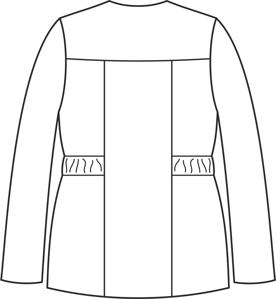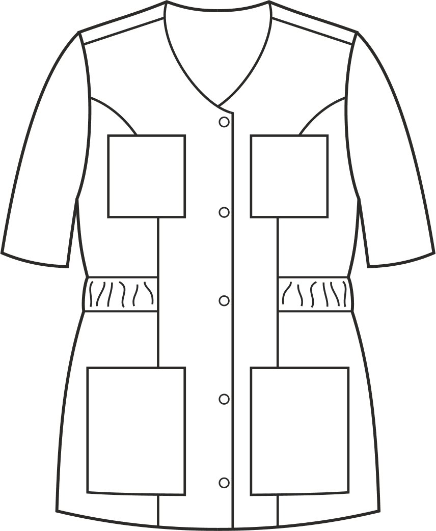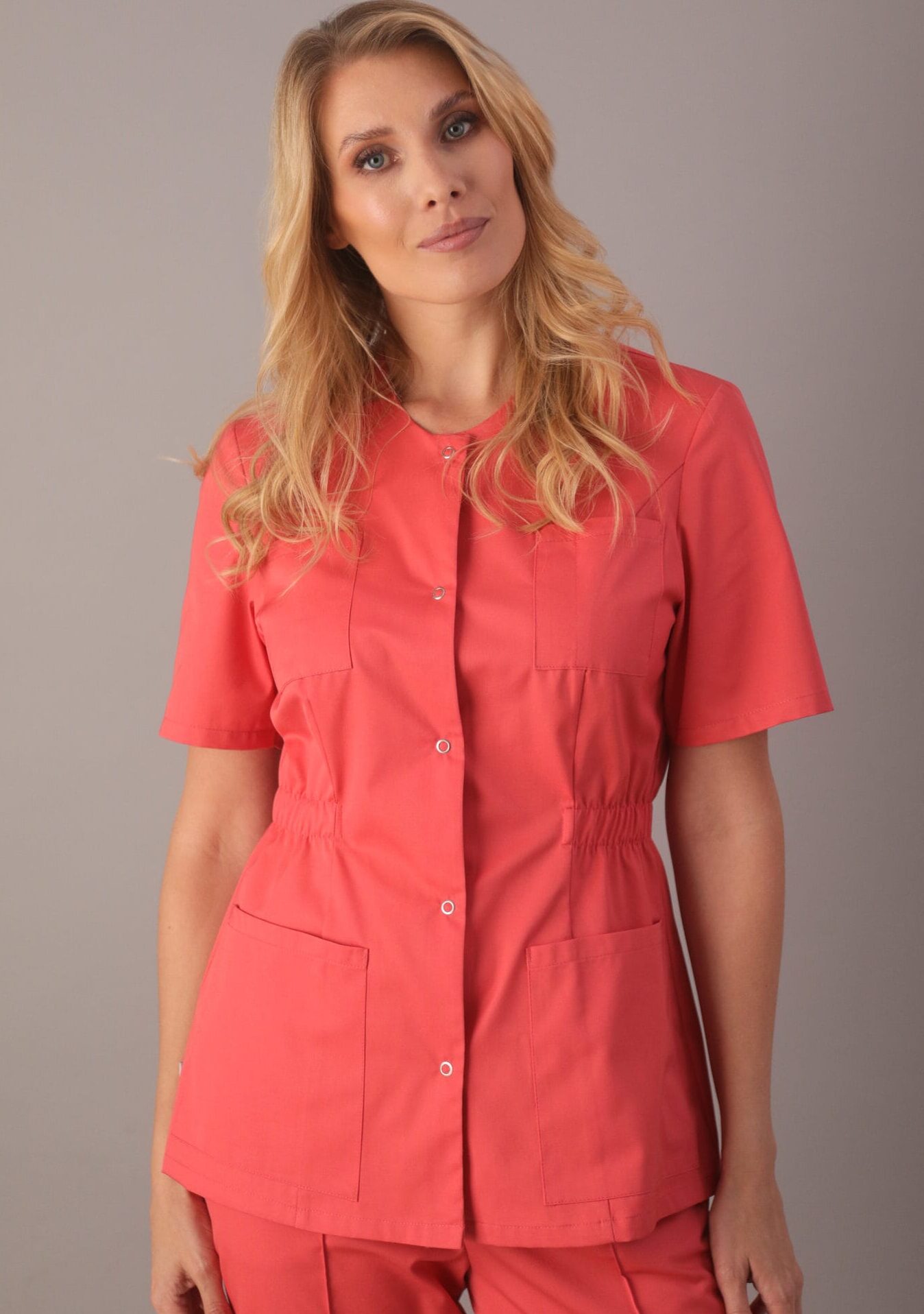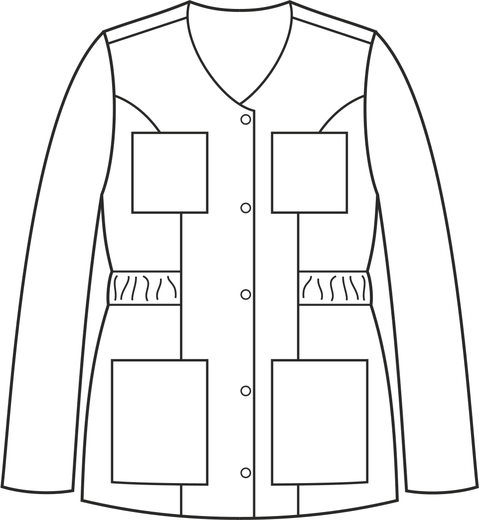 Cztery kieszenie i guma w talii wyróżniają żakiet spośród innych. Dekolt w kształcie litery V (klasyczny serek) nadaje mu elegancji. Taliowany krój oraz dwa pionowe cięcia z przodu i z tyłu, zakończone na pasku wszytym wokół talii, podkreślają kobiecą sylwetkę i dodają mu unikalnego charakteru. Wyposażony jest w dwie zaokrąglone dolne kieszenie oraz dodatkowe dwie kieszenie górne. Kolor tego modelu jest jednolity. Zapięcie na trwałe nierdzewne springi (napy) gwarantuje łatwe i wygodne zapięcie. Można go zamówić w wersji z krótkim lub długim rękawem.