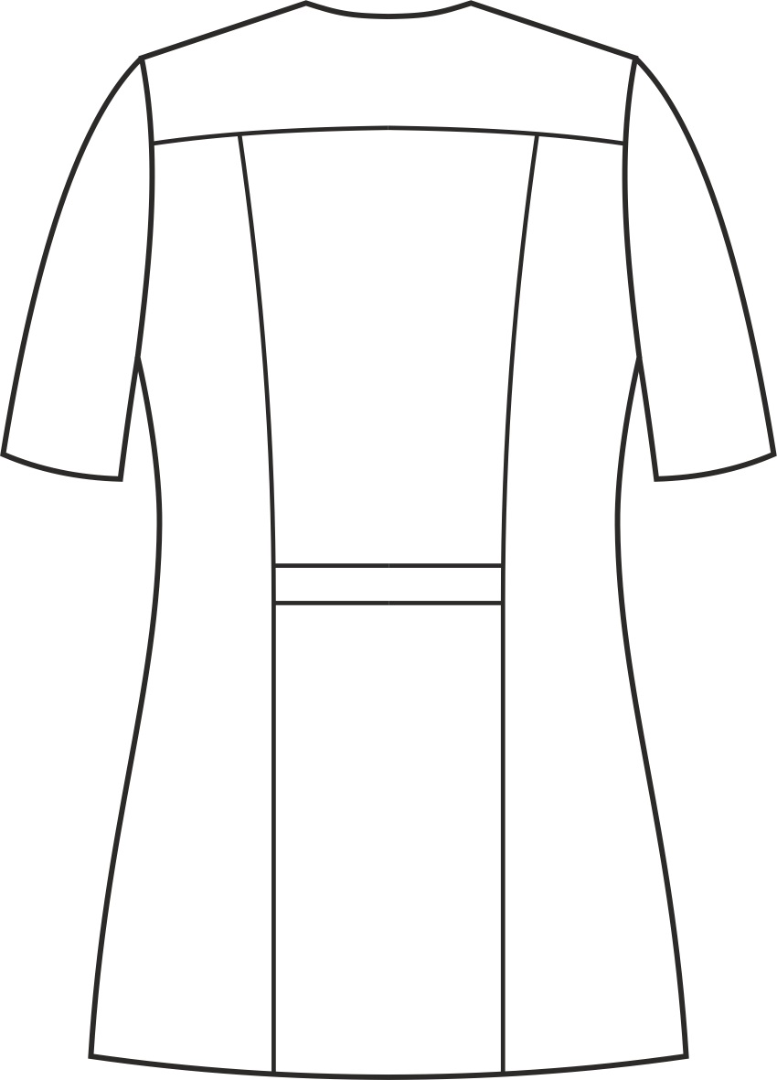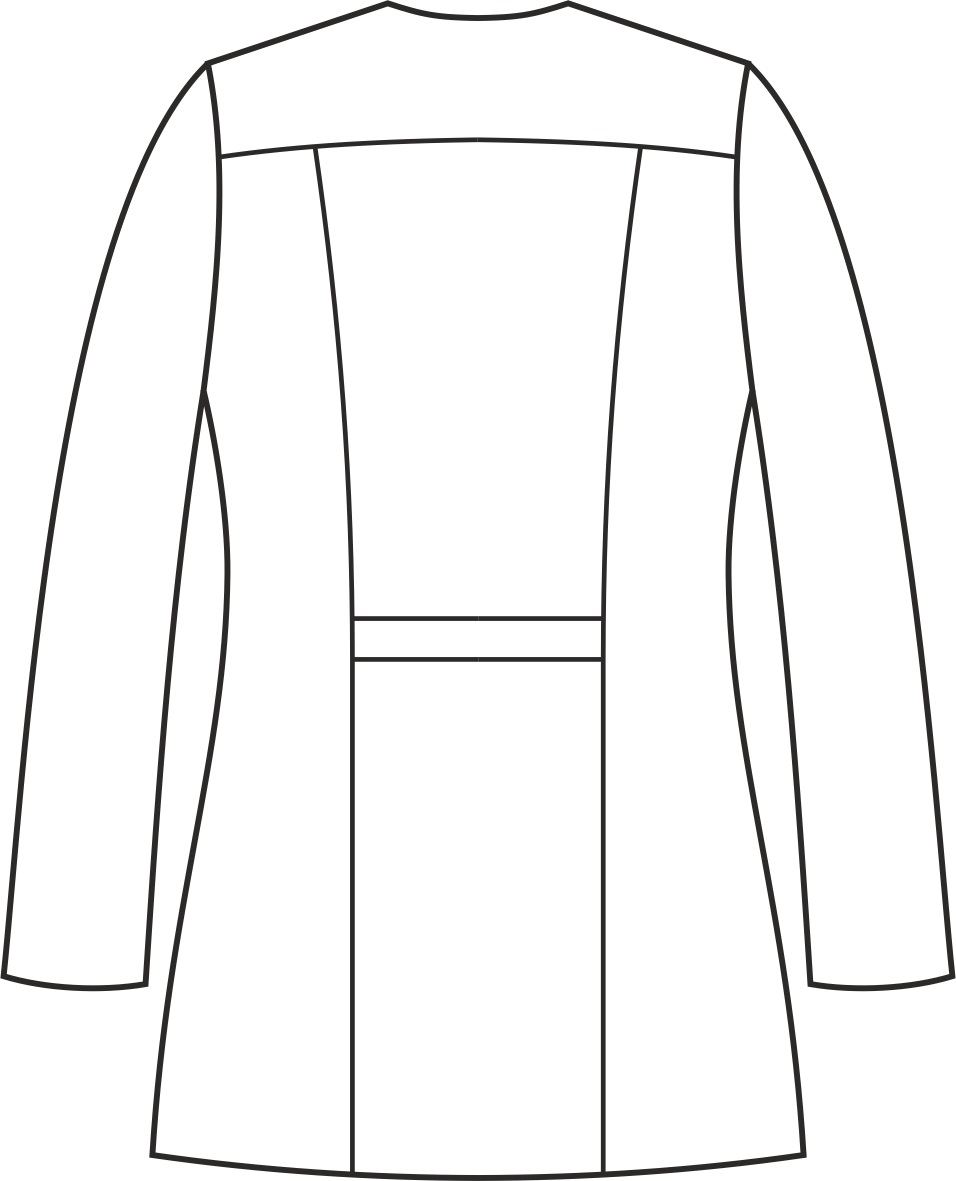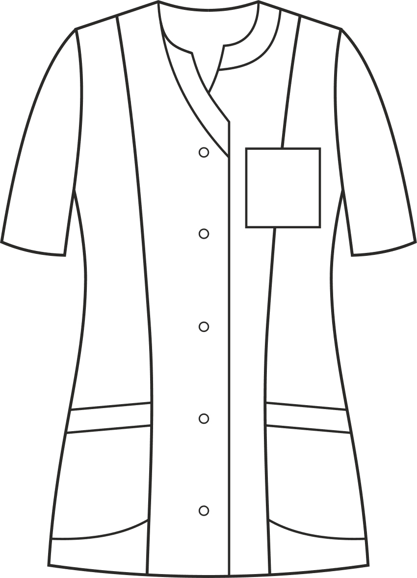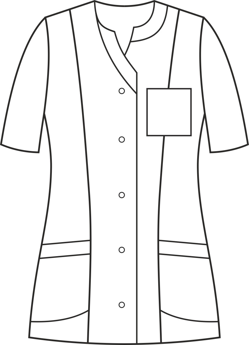 Żakiet wyróżnia się krytym zapięciem, ozdobnymi obszyciami przy szyi oraz paskiem zdobiącym talię. Posiada cięcia modelujące oraz karczek z tyłu. Podkrój szyi w kształcie półokręgu z zakończeniem w serek dodaje żakietowi subtelności i wyjątkowego stylu. Wyposażony jest w dwie skośnie wszyte, głębokie dolne kieszenie oraz dodatkową górną kieszeń na lewej piersi, oferujące funkcjonalność i wygodę przechowywania niezbędnych drobiazgów. Kryte zapięcie na trwałe nierdzewne springi (napy) ułatwia szybkie i wygodne założenie żakietu. Ten model ma długość, która zakrywa biodra. Kolor tego modelu jest jednolity, co uwydatnia jego niepowtarzalny krój. Występuje w wersji z długim oraz krótkim rękawem.