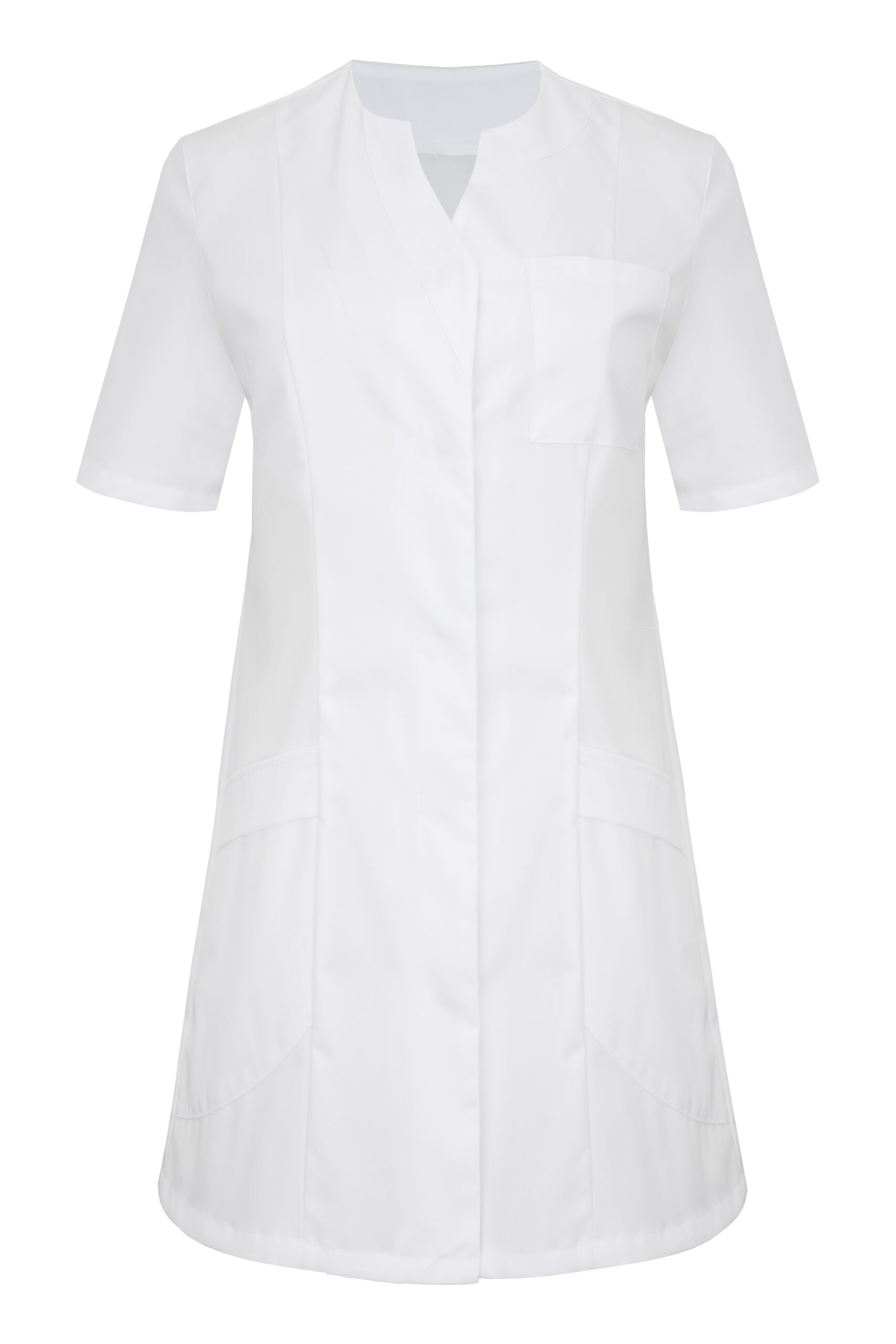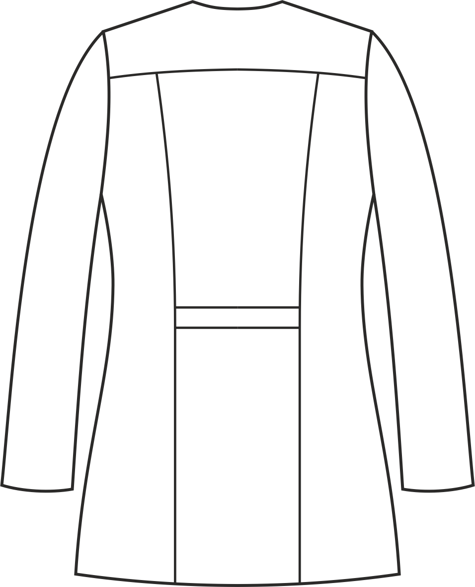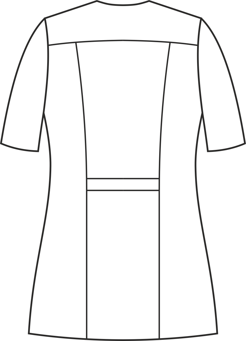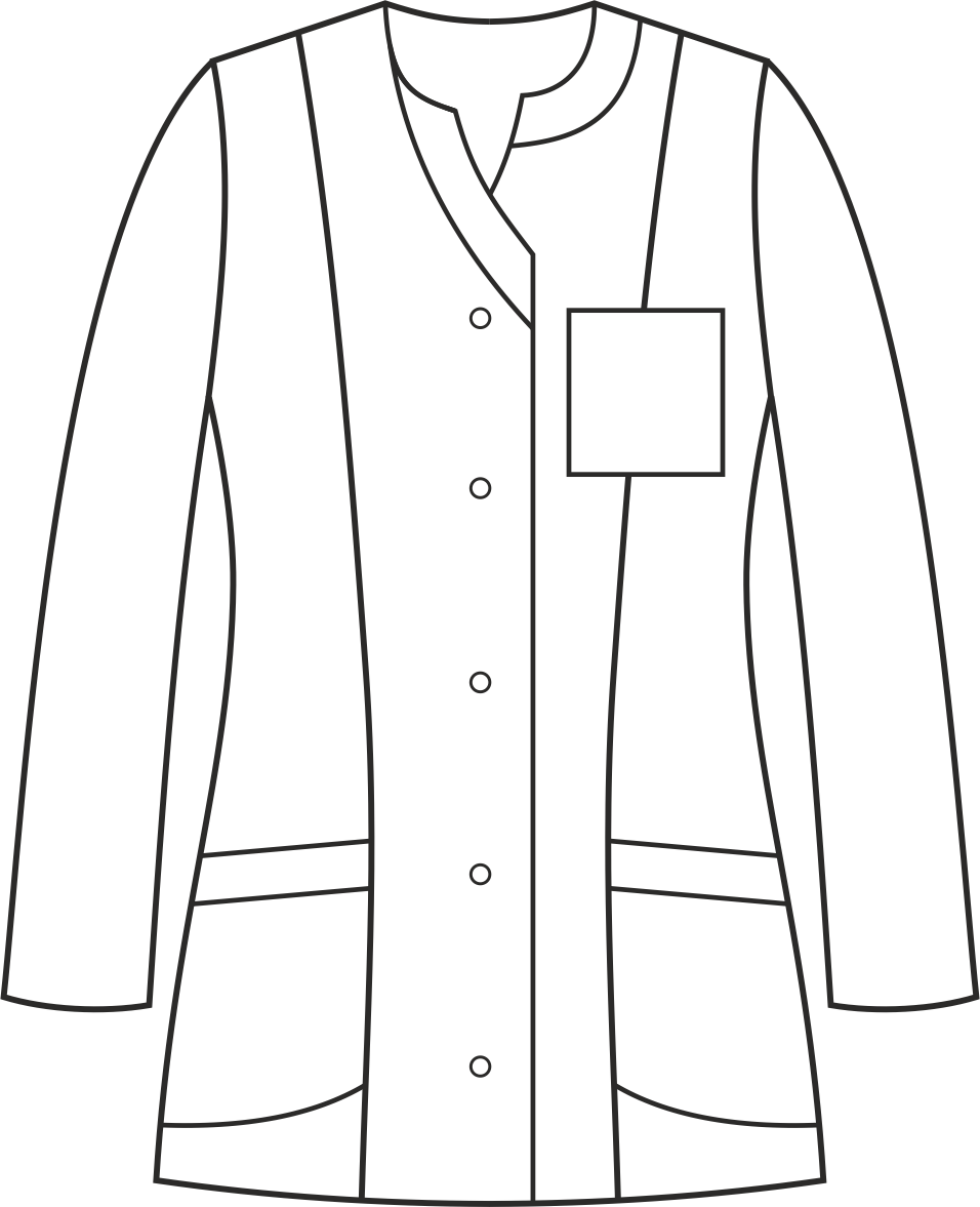 Żakiet wyróżnia się krytym zapięciem, ozdobnymi obszyciami przy szyi oraz paskiem zdobiącym talię. Posiada cięcia modelujące oraz karczek z tyłu. Podkrój szyi w kształcie półokręgu z zakończeniem w serek dodaje żakietowi subtelności i wyjątkowego stylu. Wyposażony jest w dwie skośnie wszyte, głębokie dolne kieszenie oraz dodatkową górną kieszeń na lewej piersi, oferujące funkcjonalność i wygodę przechowywania niezbędnych drobiazgów. Kryte zapięcie na trwałe nierdzewne springi (napy) ułatwia szybkie i wygodne założenie żakietu. Ten model ma długość, która zakrywa biodra. Kolor tego modelu jest jednolity, co uwydatnia jego niepowtarzalny krój. Występuje w wersji z długim oraz krótkim rękawem.