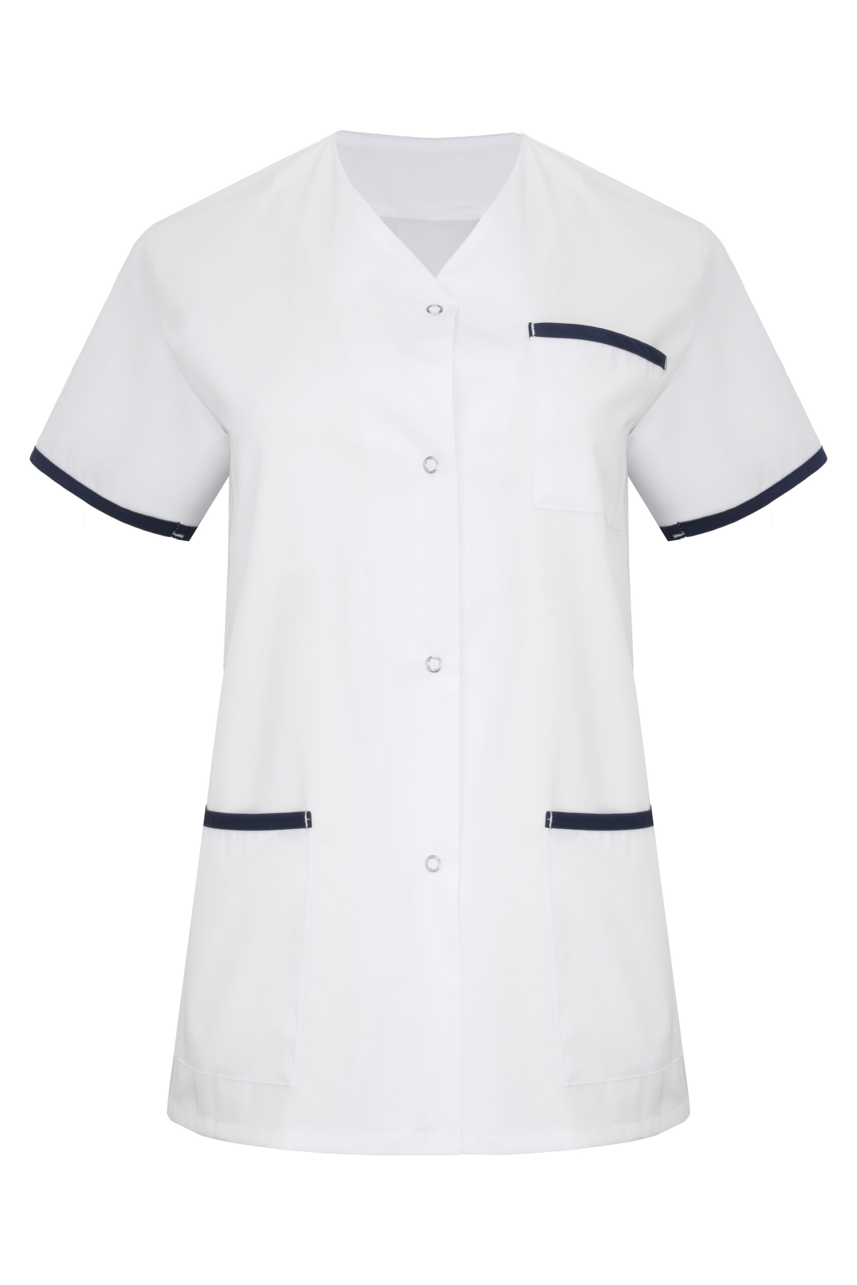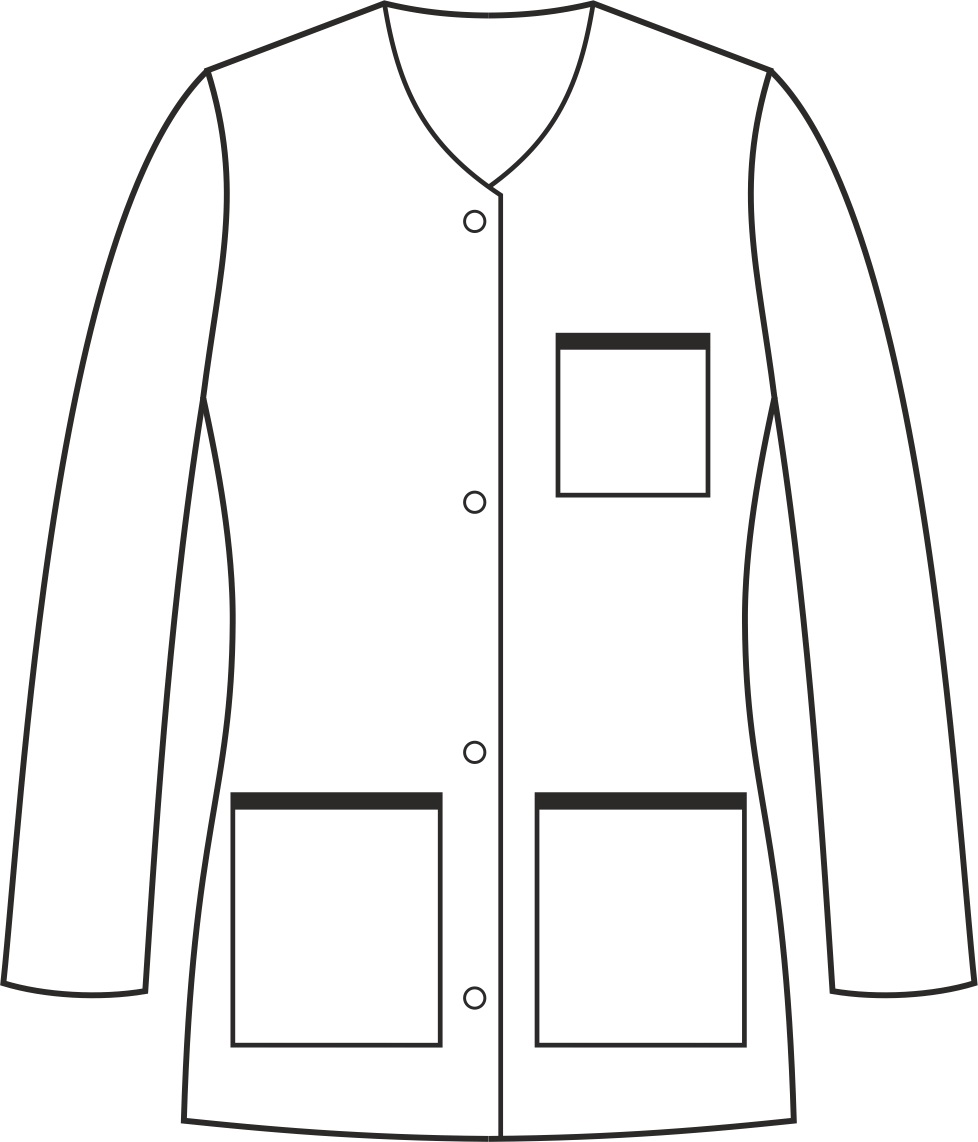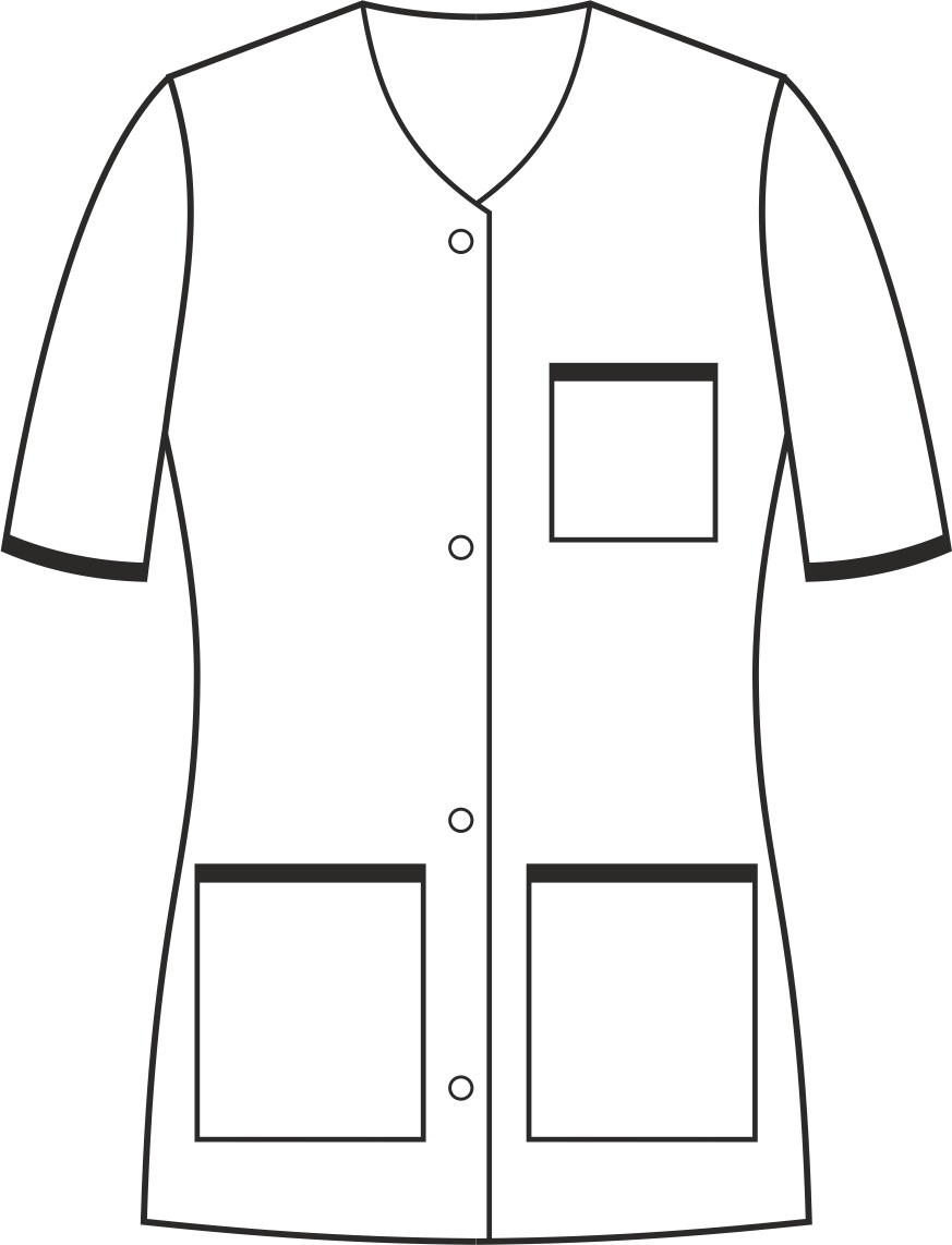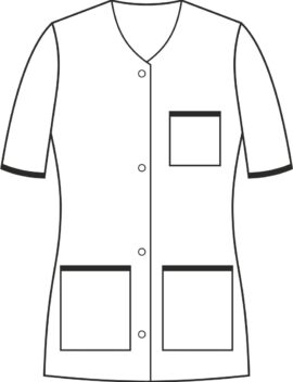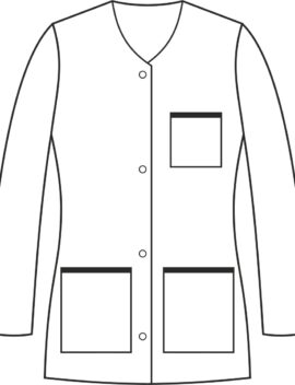 Dekolt w serek nadaje żakietowi subtelności i wyjątkowego uroku. Taliowany krój podkreśla sylwetkę. Kieszenie oraz krótkie rękawy zostały ozdobione kolorową wstawką. Dwie dolne kieszenie oraz dodatkowa górna na lewej piersi zapewniają praktyczne miejsce do przechowywania niezbędnych drobiazgów. Zapinanie na trwałe nierdzewne springi (napy) gwarantuje wygodę użytkowania. Żakiet ma lekko zakrywającą biodra długość, co nadaje mu elegancji i klasy. Można go zamówić w wersji z krótkim lub długim rękawem.
