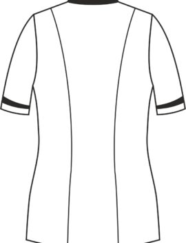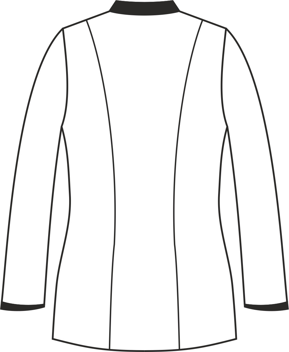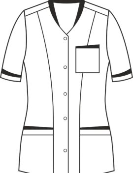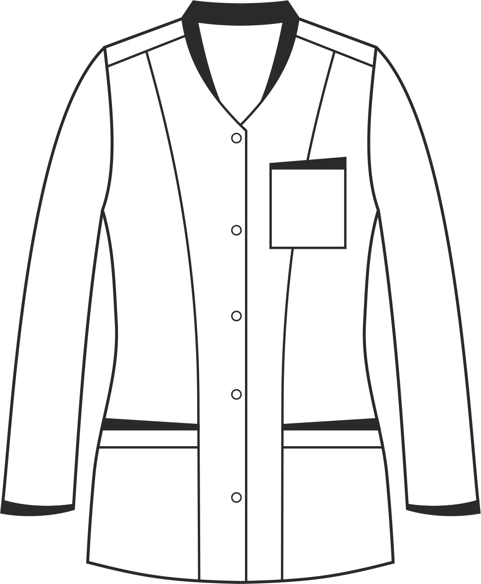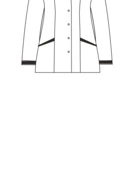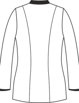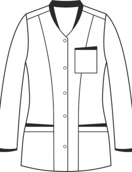Żakiet wyróżniają asymetryczne wstawki przy szyi, rękawach i kieszeniach, nadające mu unikalnego i nowoczesnego wyglądu. Posiada z przodu i z tyłu dwa pionowe cięcia modelujące oraz dwie dolne, symetrycznie naszyte kieszenie, które umożliwiają przechowywanie niezbędnych przyborów. Dodatkowo, na lewej piersi, znajduje się kieszonka idealna do przechowywania drobnych przedmiotów, takich jak długopisy czy notatki. Zapinany jest na trwałe nierdzewne springi (napy), które gwarantują wygodne i bezproblemowe zapięcie. Dekolt w kształcie litery V z delikatną stójką dodaje mu stylu i wyrazistości. Cechuje go taliowany krój i praktyczna długość, lekko zakrywająca biodra. Model jest dostępny w wersji z krótkim lub długim rękawem.