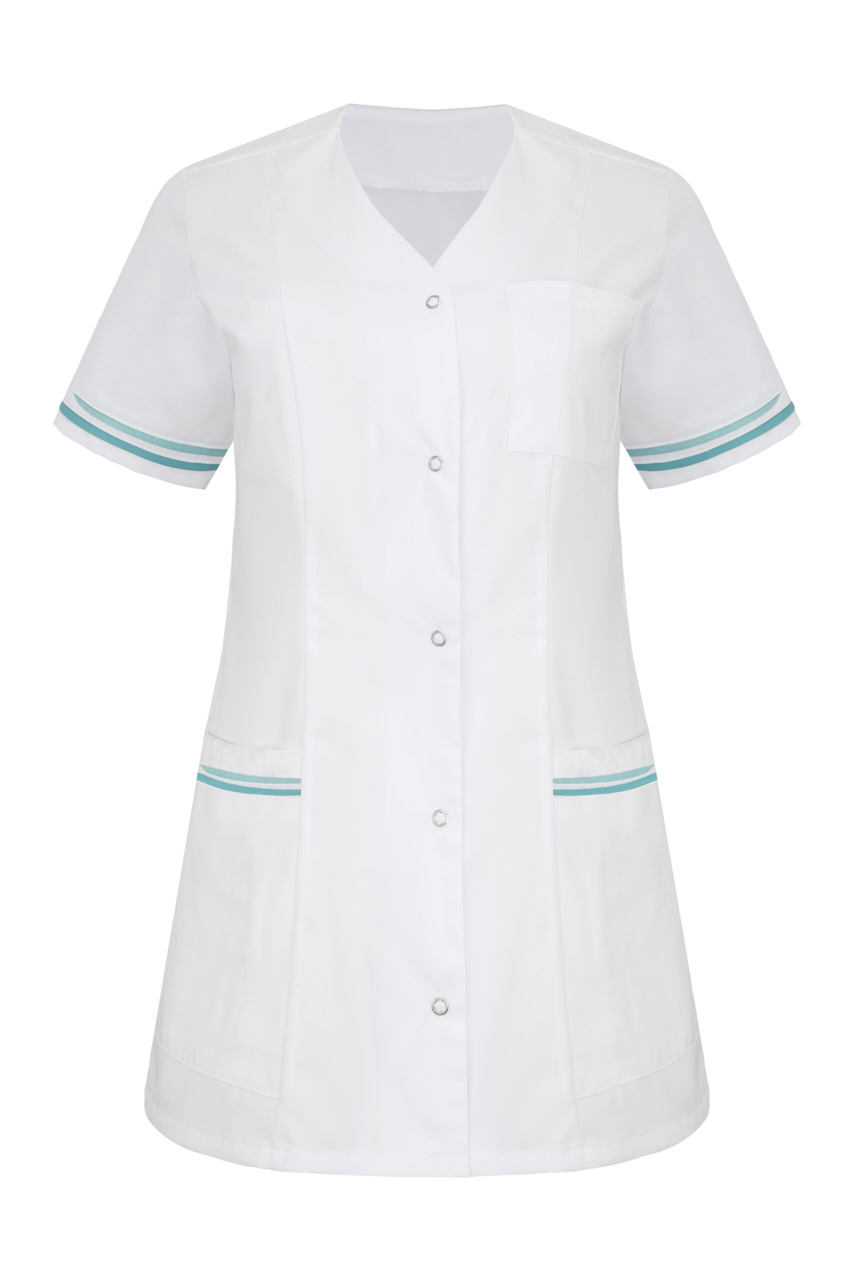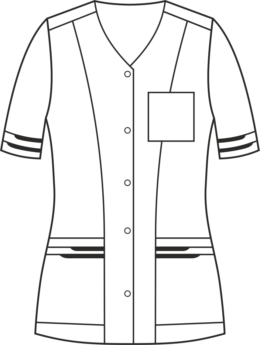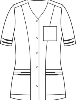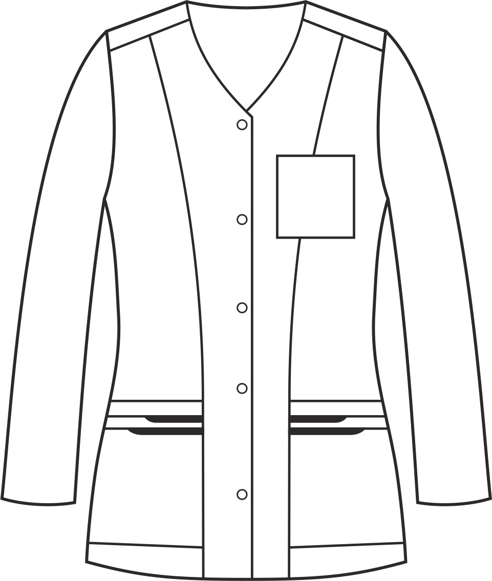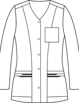 Żakiet jest idealny dla osób, które cenią sobie profesjonalny wygląd i praktyczne rozwiązania w swojej pracy. Posiada taliowany krój, dwa modelujące, pionowe cięcia z przodu oraz gładki tył, co nadaje mu lekko dopasowaną, ale jednocześnie wygodną formę. Szczególną uwagę przykuwają niepowtarzalne detale. Dolne kieszenie oraz krótkie rękawy ozdobione są oryginalnymi, podwójnymi wstawkami nadającymi subtelnej elegancji. Dekolt wykończony jest w kształcie litery V (serek). Żakiet dostępny jest w wersji z krótkim lub długim rękawem, zapinany na nierdzewne springi (napy), zapewniające łatwe i wygodne zapięcie. Model posiada dwie dolne, symetrycznie naszyte kieszenie. Dodatkowo, na lewej piersi znajduje się kieszonka idealna na mniejsze przedmioty.