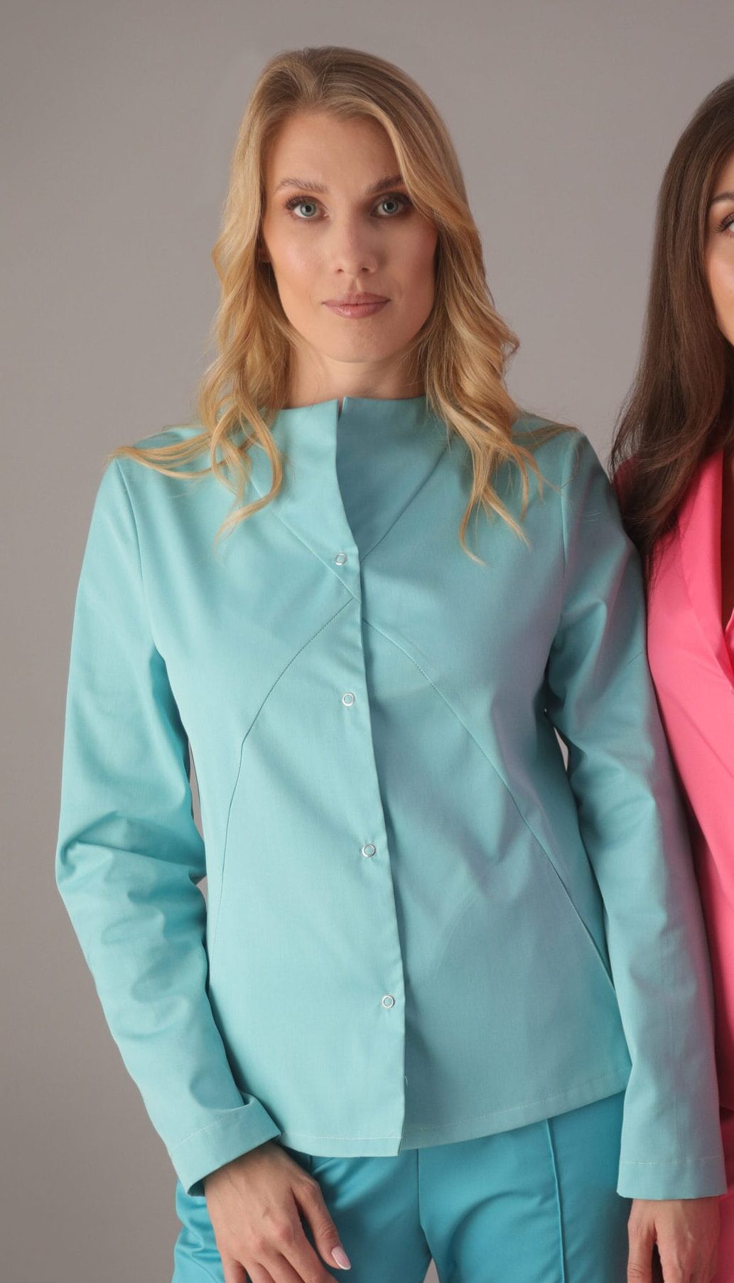 Żakiet zapewnia wygodę i wyrazisty styl. Asymetryczne cięcia modelujące stanowią subtelny akcent. Dekolt wykończony wyłogami, które mogą zakrywać albo odkrywać szyję, dodaje elegancji i klasy. Długość żakietu została zaprojektowana tak, aby lekko zakrywać biodra. Taliowany krój oraz modelujące zaszewki podkreślają sylwetkę. Żakiet wyposażony jest w jedną dużą dolną kieszeń, która jest zarówno praktyczna, jak i dodaje charakteru całej stylizacji. Nierdzewne springi (napy) gwarantują łatwe i szybkie zapinanie odzieży. Żakiet występuje w wersji z długim oraz krótkim rękawem.
